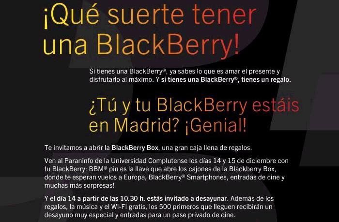 Acércate  al paraninfo de la universidad complutense de Madrid y conoce la nueva BlackBerry Box. No olvides traer tu blackberry. Tu pin es la llave para abrir la BlackBerry Box y poder conseguir tu regalo.
